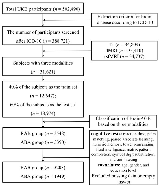 The selection process, detailed in the accompanying Figure 1, adhered to rigorous criteria aimed at ensuring data quality. Exclusion was based on the International Classification of Diseases, Tenth Revision (ICD-10), diagnostic classification system. Individuals diagnosed with malignant tumors of the eye, brain, and other parts of the central nervous system; cerebrovascular disease; psychiatric and behavioral disorders; neurological disorders; and other disorders affecting brain health were excluded from the analysis. This screening procedure led to the inclusion of 388,721 subjects between the ages of 45 and 83. Subsequently, 31,621 subjects possessing comprehensive sMRI, dMRI, and rsfMRI data were selected. This subset was then randomly divided into a training set (40%) and a test set (60%) to implement the brain-age prediction model. Within the test set, individuals exhibiting characteristics of ABA or RBA were identified using the brain-age prediction model. Specifically, individuals demonstrating a positive BrainAGE across all three imaging modalities were assigned to the ABA group. Conversely, those displaying consistently negative values in all three imaging modalities were assigned to the RBA group. Furthermore, participants who had not completed all nine cognitive tests, as well as those with incomplete data on covariates, were eliminated from the final analysis. As a result, the study ultimately comprised 1949 subjects classified within the RAB group, characterized by a mean age of 63.6 years with a standard deviation of 7.97. Concurrently, the ABA group encompassed 3203 subjects with a mean age of 64.6 years and a standard deviation of 6.96.