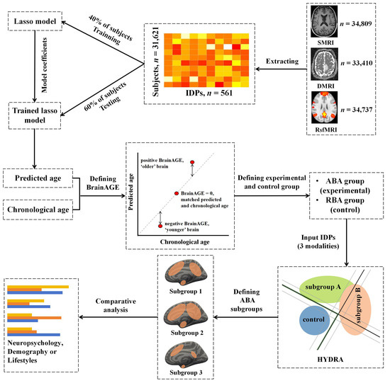 In the course of this scientific investigation, BrainAGE functions as the pivotal tool for the stratification of the aging population into ABA and RBA subpopulations. Subsequent to this stratification, our study delves into the nuanced task of estimating diverse aging trajectories within the ABA population relative to the RBA. This intricate analysis is facilitated through the utilization of multimodal MRI image features. This research methodology signifies a departure from previous studies as it entails the examination of a notably expansive dataset comprising 5152 subjects. Within this dataset, 1949 subjects are representative of the ABA subpopulation, while 3203 represent the RBA subpopulation. The data were meticulously sourced from the UK Biobank (UKB) database, a reservoir of information that spans multiple distinct imaging modalities. Specifically, the brain imaging-derived phenotypes (IDPs) encompass 207 features derived from structural magnetic resonance imaging (sMRI), 144 features from diffusion magnetic resonance imaging (dMRI), and 210 features from resting-state functional magnetic resonance imaging (rsfMRI). This comprehensive approach substantially fortifies the robustness of our analysis, enabling a more nuanced understanding of the intricate interplay between ABA subpopulations and their corresponding neuroimaging profiles. By meticulously dissecting these multimodal MRI features, our investigation aims to contribute novel insights into the complex landscape of ABA, thus advancing our comprehension of the underlying mechanisms at play within the aging process.