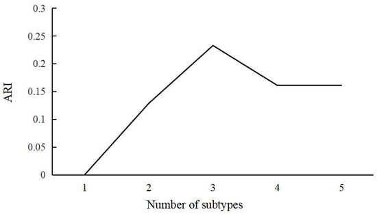 Within the confines of this investigation, the HYDRA framework was implemented to partition ABA heterogeneity, where the ABA population assumed the role of the experimental group, and the RBA population served as the control group. Subsequent to this partitioning, meticulous scrutiny of the fidelity of cluster assignment transpired. The examination involved systematically varying the cluster number from 1 to 5, employing the ARI as the metric for assessment. The ARI quantifies the similarity between true and predicted cluster assignments, offering a measure of clustering accuracy that accounts for chance. Notably, a monotonically increasing trend was observed within the range of 1 to 3 subtypes. However, as the subtype count extended to 4 and 5, a relative decline in the ARI values was discerned in comparison to the trinary configuration. This observation suggests that clustering efficacy may be optimized into three distinct subtypes (refer to Figure 3). It is imperative to note that HYDRA employed a robust five-fold cross-validation strategy. The delineation of optimal subtypes reflects the outcomes observed in the validation sets across these folds. Subsequent analysis delineated that, based on the cross-validation result, 783 individuals from the ABA cohort were allocated to SubGroup 1, while SubGroup 2 comprised 561 ABA subjects, and SubGroup 3 encompassed 605 ABA subjects.