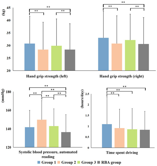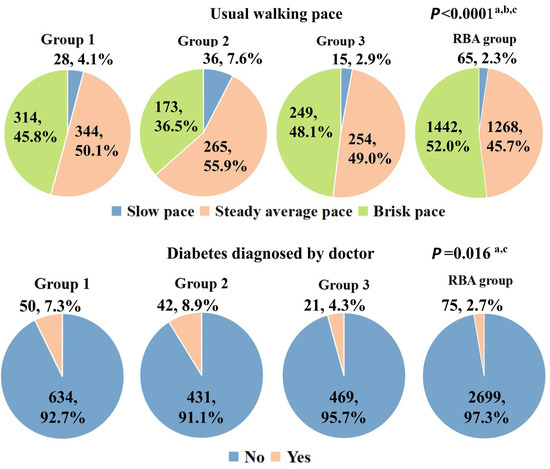 Shifting the focus to Non-IDPs, differences among the subtypes are illustrated in Figure 10 and Figure 11. SubGroup 2 exhibited the most pronounced distinctions compared to the other two ABA groups, featuring elevated blood pressure, diminished grip strength, a higher prevalence of confirmed diabetes, and a slower pace in usual walking. SubGroups 1 and 3 displayed relatively fewer differences, primarily diverging in the time spent driving and usual walking pace. Concurrently, notable distinctions were observed in blood pressure, confirmed diabetes prevalence, and usual walking pace between SubGroup 2 and the RBA group. However, no statistically significant differences were identified in grip strength values and driving time. In the case of SubGroup 1, marked disparities were evident in all Non-IDP variables as compared to the RBA group, except for the prevalence of diagnosed diabetes.