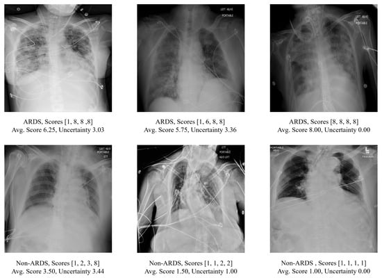 The upper panel displays the CXR scans of patients diagnosed with ARDS, while the lower panel shows scans of patients without ARDS. The score array represents the annotation score provided by multiple reviewers together with the averaged score and the corresponding measurement of uncertainty (as defined in Section 2.3).
