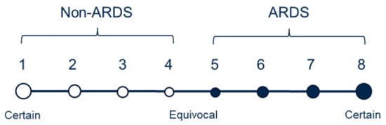 Diagram for the different labeling scores on a scale of 1 to 8. Solid circles indicate diagnoses of ARDS, while empty ones represent non-ARDS. The size of the circles represents the certainty level of an assigned score.