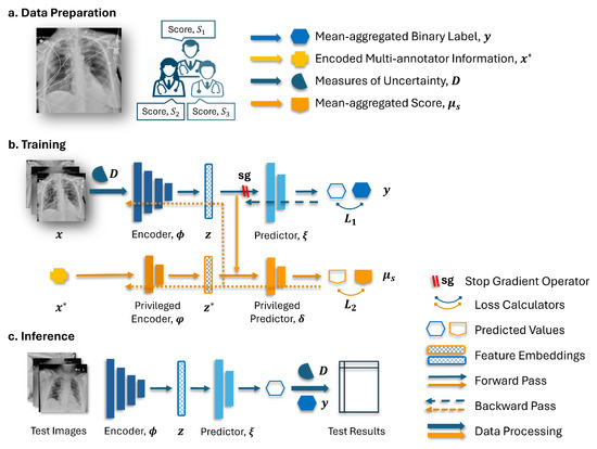 Figure 4 illustrates the diagram of the proposed method encompassing data preparation, model training, and inference. As depicted in Figure 4b, the employed model integrated two branches in its network architecture. The base branch includes an encoder denoted as and a predictor labeled as . Meanwhile, the privileged branch comprised a privileged encoder represented as and a privileged predictor labeled as .
