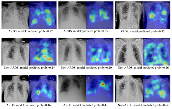 Chest X-rays (CXRs) are key in the clinical diagnosis of ARDS, specifically the radiological presence of bilateral infiltrates. CXRs usually demonstrate evidence of ARDS in the form of bilateral diffuse alveolar opacities, which may appear as consolidations as ARDS progresses. Nevertheless, the image findings may vary depending on the stage and severity of ARDS, and they may be subtle within the first 24 h following lung insult [4]. Additionally, radiological features alone are nonspecific and may not correlate with clinical findings. As a result, poor agreements (a Cohen’s of <0.27) among clinicians on CXR interpretations for ARDS diagnosis have been reported [5,6]. Given that ARDS has a fast-progressing nature, recognizing and treating this condition promptly is crucial for better patient outcomes. Therefore, approaches that can identify ARDS from CXRs are urgently needed to provide patients with timely and evidence-based care.