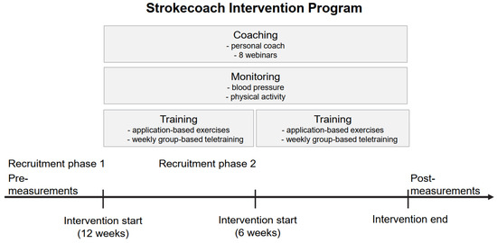 The Strokecoach Intervention Program has been developed to encourage stroke survivors to achieve a higher level of targeted exercise training at home, thereby improving their independence in daily life and reducing the risk of further strokes. The SIP (Figure 1, Table 1) combines training, coaching, and monitoring, lasted three months and was originally designed as a blended-care model, with participants training once a week in small groups, combined with an application-based exercise program at home. Due to the COVID-19 pandemic, which led to a complete lockdown and social restrictions in Germany for months, the SIP was changed to a telerehabilitation-only program that included a combination of home training and weekly online group sessions. The Strokecoach application [33] was developed by the Strokecoach company (Strokecoach GmbH, Cologne, Germany) and could be downloaded free of charge. All participants received an individual code for registration and if necessary, they were supported by their personal coach for technical assistance. The application itself was not modified or adapted during the intervention process. The intervention was conducted in the greater region of North Rhine-Westphalia (Germany).
