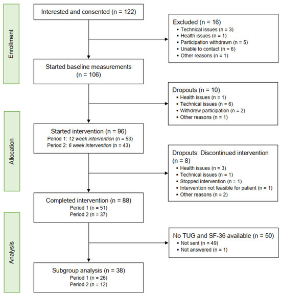 We analyzed data from a subgroup of patients for whom pre- and post-intervention measures were available from the TUG and SF-36 on the data from the TUG, SF-36 and the general health questions. Paired-samples t-tests were used for pre–post comparison and normality distribution was checked with the Shapiro–Wilk test. If the assumption of normality was violated, the Wilcoxon signed-rank test, a non-parametrical test, was used instead. The alpha level for statistical significance was set to 0.05. Statistical analysis was performed with R Statistical Software (RStudio, v2023.06.0+421, Posit Software, PBC) and JASP (v0.17.0, The Jasp Team, Amsterdam, The Netherlands).