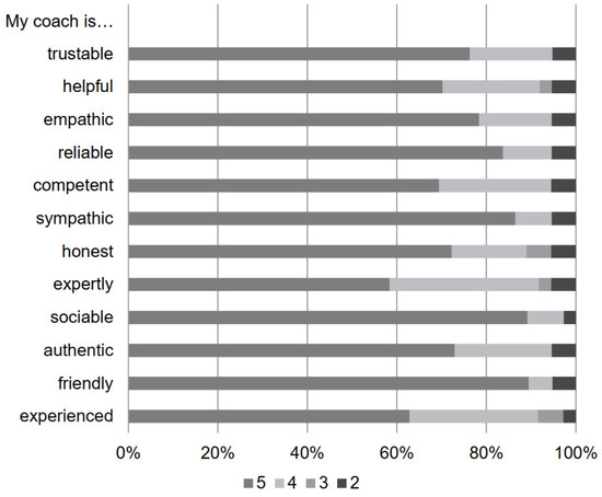 - For the evaluation of coaching aspects, online questionnaires were sent. Webinar attendance was evaluated dichotomously. The questions about their webinar experience were rated on a visual analogue scale (from “not at all useful” to “very useful”). Based on the Counselor Rating Form–Short Version (CRF-S) [45], the coach was rated on different items (friendly, experienced, authentic, sociable, competent, honest, sympathetic, reliable, empathic, helpful, expertly, trustworthy) with 0 = not at all to 5 = very much.