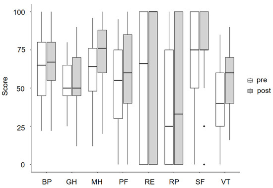 SF-36 scores pre- and post-intervention (n = 38). BP = bodily pain, GH = general health, MH = mental health, PF = physical functioning, RE = role limitations due to emotional health, RP = role limitations due to physical health, SF = social functioning, and VT = vitality.