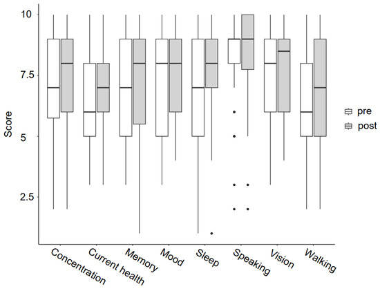 General health was determined by different questions. Medians on a 10-point rating scale for self-estimated walking ability, concentration and current health were slightly improved after the intervention (Figure 5). The Wilcoxon signed-rank test confirmed this trend. However, there was no change in speaking ability, mood, vision, sleep and memory function. For exact values and statistics, please see Supplementary Table S3.