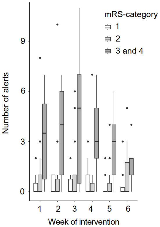 The average number of blood pressure alerts per week for the participants depending on the mRS category is shown in Figure 6. They did not change over the intervention duration. On average, patients had an alert on 14.4% (SD = 17%) of their intervention days. In general, there were mainly alerts of hypertension stage 1. We could analyze the number of alerts for 6 weeks of the intervention period for 41 patients. In total, they had 1534 measuring days, with 225 alerts of hypertension stage 1, 14 alerts of hypertension stage 2 and only one alert of hypertension stage 3.