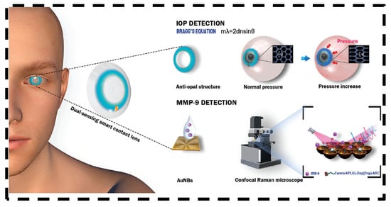 Wang et al. developed a smart contact lens with a dual-sensing platform for real-time monitoring of IOP and detecting matrix metalloproteinase-9 (MMP-9) in tears, which is a biomarker in eye-related diseases including glaucoma [42]. The unique design (Figure 4) contained surface-enhanced Raman spectroscopy (SERS) substrates. IOP could be monitored by observing structural color changes, and glaucoma could be predicted using quantitative SERS measurement of MMP-9 levels in tear film. Tests using porcine eyes found that the contact lens provided accurate measurements of IOP in the range from 0 to 30 mmHg (R2 = 0.98), covering the normal physiological IOP range (10–20 mmHg). Meanwhile, the SERS analysis can effectively detect MMP-9 down to concentrations of 1.29 ng/mL.