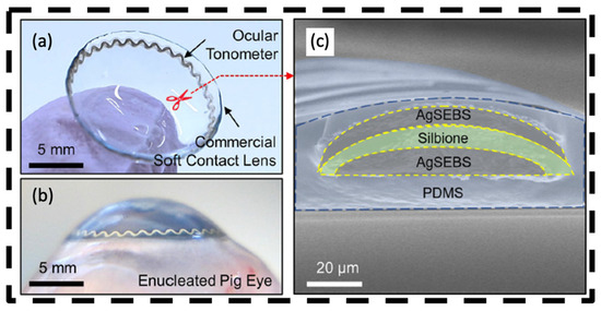 Schematic and optical images of smart soft contact lens for 24 h IOP monitoring. (a) Photograph of the contact lens. (b) Cross-sectional scanning electron microscope (SEM) image of the contact lens. (c) Photograph of the contact lens in an enucleated pig eye. Open access [49]. Copyright 2022, Springer Nature.
