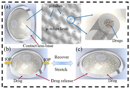 Schematic illustration of contact lens embedded with microtubes as drug containers. (a) Schematic diagram of the contact lens with embedded microtubes as drug containers for diffusion-based drug delivery and adaptive drug delivery. (b) Schematic of the contact lens device under a neutral state for diffusion-based drug release. (c) Illustration of the mechanically stretched contact lens device with more drug being released. Adjusted with permission [80]. Copyright 2020, American Chemical Society.