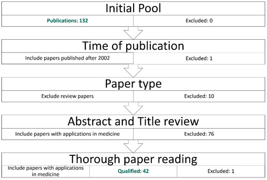 A second screening was performed to identify articles that did not qualify based on the inclusion criteria. The latter operation resulted in the exclusion of one publication. Hence, the pool material for review included 42 papers.