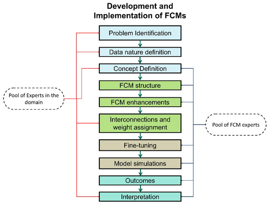 Creating an FCM involves a structured and iterative process encompassing problem definition, concept identification, causal relationship elicitation, initial state assignment, rule specification, FCM construction, learning algorithm selection, training and validation, model output and interpretation, and model refinement [17,18]. The pipeline (Figure 2) ensures that FCMs are designed effectively to represent the dynamics and relationships within complex systems, enabling accurate predictions, decision-making, and knowledge extraction.