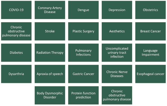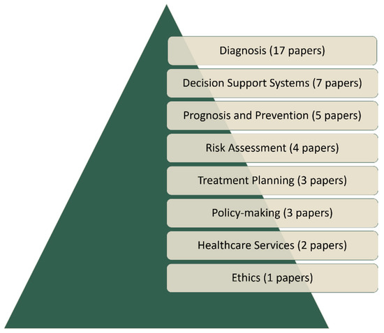 The literature review identified seven categories of applications, namely, prognosis and prevention, risk assessment, treatment planning, policymaking, healthcare services, and ethics (Figure 3).