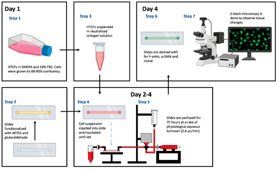 HTCFs were grown until 90–100% confluent in a 25 mL Falcon flask, dissociated using trypsin (Fisher Scientific, Waltham, UK), and quantified. The pellet was resuspended in DMEM supplemented with 2% FBS to a concentration of 6.25 × 104 cells/µL. To create the hydrogel, 80 µL of rat tail collagen solution (1.8 mg/mL), 8 µL Waymouth media (Gibco, Cat# 15290018), and 8 µL sterile NaOH solution (0.275M) were mixed, and 4 µL of the cell suspension was added [27]. A total of 50 µL of the collagen–HTCF liquid hydrogel was cast into the functionalized microfluidics slide and incubated at 37 °C in 5% CO2 for 30 min until solidified. The final HTCF concentration within the hydrogel was 2.5 × 106 cells/mL.
