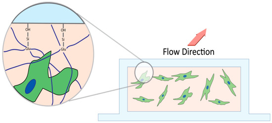 To covalently link collagen to the slide chamber, a µ-slide I microfluidic slide (Ibidi #80176 Fitchburg, MA, USA) was salinized with vaporized 3-Aminopropyl-triethoxysilane (APTES) (Sigma-Aldrich, Oakville, ON, Canada). APTES was heated to 150 °C, and the fumes were pushed through the slide with a syringe pump (Harvard apparatus) for one hour at a rate of 60 mL/h. Unfunctionalized APTES was purged with 10 mL PBS (pH 7.4). After salinization, glutaraldehyde was bonded to the APTES by incubating a 6% glutaraldehyde (Sigma-Aldrich, Oakville, ON, Canada) solution for 30 min at ambient temperature, followed by washing with 10mL PBS (Figure 2). Finally, the chamber was sterilized by perfusing 70% ethanol followed by PBS before manipulation in a sterile hood [28,29].