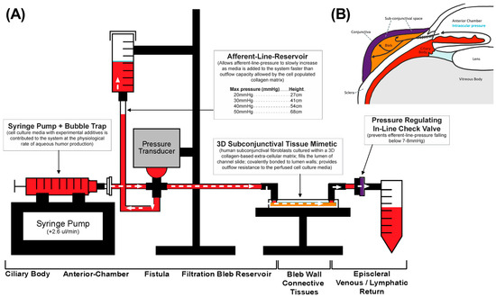 Microfluidics model (A) mimics anatomical qualities of surgical filtration bleb (B). Perfusate from the syringe pump mimics aqueous humor production in the ciliary bodies (red). The surgical filtration bleb (orange) is modelled by the collagen hydrogel in the slide chamber. Finally, a pressure gated one-way valve is down located downstream of the slide chamber to mimic episcleral back pressure (purple). As the cells within the hydrogel proliferate, hydrodynamic changes lead to impaired flow. Consequently, perfusate accumulates in the influent pressure column, which can be read manually or measured through the pressure transducer upstream representing IOP.