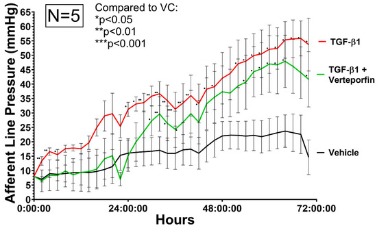Relative afferent line pressure is increased in HTCF subconjunctival tissue-mimetic treated with TGF-β1 (red). Verteporfin (green) co-treatment decreased afferent line pressure. Pressure is measured in real-time with a blood pressure transducer representing model IOP. Relative pressure changes are normalized to average pressure values in the first hour of the experiment. Data shown are the means ± standard error (SEM) from N = 5 primary HTCF patient samples. (*) indicate significant differences between samples (* p ≤ 0.05; ** p ≤ 0.01; *** p ≤ 0.001) by 2 way ANOVA.