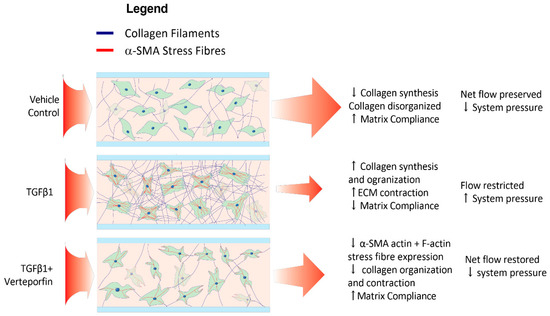 Verteporfin attenuates TGF-β1-mediated changes within HTCFs in the hydrogel. The net effect of TGF-β1 leads to myofibroblastic transdifferentiation indicated by increased cell bulk and α-SMA production. Myofibroblasts organize and contract ECM, lowering hydrogel permeability to perfusate and increasing system pressure. Verteporfin attenuates TGF-β1 mediated myofibroblastic transformation thereby lessening pressure increases.