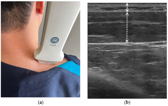 The US scanning process is illustrated in Figure 1. The US measurement sites were selected based on previous studies: the midpoint of the upper trapezius and biceps brachii muscles on the participant’s dominant arm [4]. Anatomical marks and US sites were indicated using a hypoallergenic surgical marking pen: the upper trapezius measurement site (midpoint between the acromion process of the scapula and the 7th cervical vertebrae) and the biceps brachii measurement site (midpoint between the acromion process and the elbow crease).