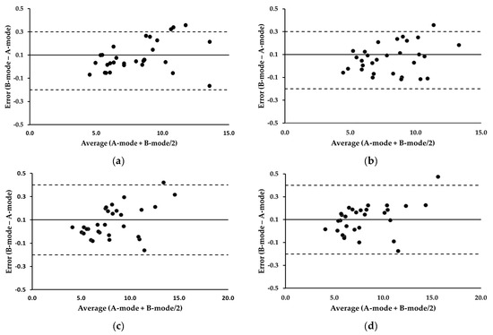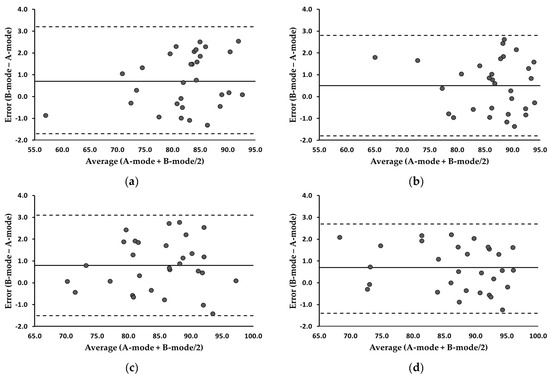 Bland-Altman plots illustrating error scores (B-mode minus A-mode) for the trapezius and biceps brachii. (a) Trapezius, pre-exercise; (b) trapezius, post-exercise; (c) biceps brachii, pre-exercise; (d) biceps brachii, post-exercise. The averages of the error scores are presented as solid lines. The 95% LOA are presented as dotted lines.