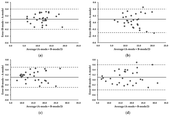 Bland-Altman plots illustrating error scores (B-mode minus A-mode) for the trapezius and biceps brachii. (a) Trapezius, pre-exercise; (b) trapezius, post-exercise; (c) biceps brachii, pre-exercise; (d) biceps brachii, post-exercise. The average of the error scores is presented as a solid line. The 95% LOA are presented as dotted lines. All values are expressed in millimeters.