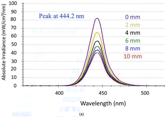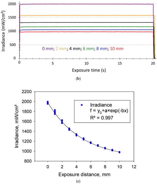 LCU characteristics as a function of exposure distance: (a) spectral distribution; (b) variation in the irradiance within the 20 s exposure; (c) exponential decay of irradiance with exposure distance.
