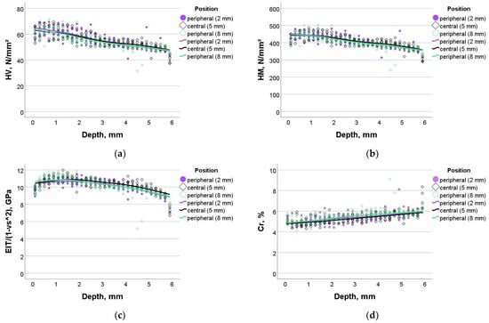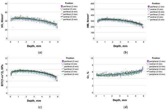 The variation in HV, HM, EIT, and Cr for the experimental composite (Exp) as a function of sample depth and measurement position is summarized in Figure 2a–d. The variation in the measured parameters was non-linear, with a slight increase in properties up to a depth of 1–2 mm, followed by a constant variation and the beginning of a slight decrease starting with a depth of 4 mm. There was a very slight superiority of the central position over the peripheral positions, while both peripheral positions appeared to be identical. The opposite of the described behavior was observed for creep, where there were no differences between measurement positions. Creep values began to increase at depths around 4 mm.