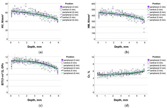 The variation in the measured parameters in the depth of the 6 mm test specimen is shown below for the three different positions of the 10 mm-wide section. For this purpose, a central position line (central 5 mm) was approached as well as two peripheral positions, each positioned 3 mm to the left (peripheral 2 mm) and right (peripheral 8 mm) in relation to the central (central 5 mm) position. The specified mm corresponds to the 10 mm-wide test specimen, with 0 mm being the position located at one margin and 10 mm the other. Measurements were recorded in 0.1 mm steps.