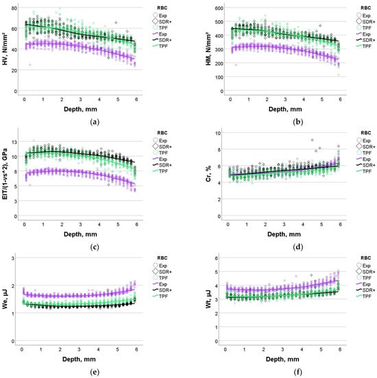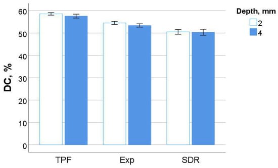 The measured values for TPF were very close to SDR+ and were higher compared to the experimental composite (see statistics below), while the pattern of variation with the depth and width of the samples was as described above (Figure 4a–d).