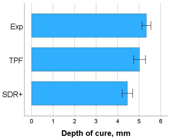 Depth of cure (DOC, Figure 6) was calculated taking into account the variation in HV with depth and indicating the depth at which HV decreased below 80% of the 0.1 µm sub-surface value. A univariate general linear model identified a significant and moderate effect of the material on the DOC (p < 0.001, partial eta-squared η2P = 0.363), while position did not significantly influence it (p = 0.578). The binary combination of material and position also had no effect (p = 0.303). Exp and TPF showed similar (p = 0.135) and the significantly highest DOC values (5.3 mm and 5.0 mm, respectively) compared to SDR+ (4.5 mm, p < 0.001).