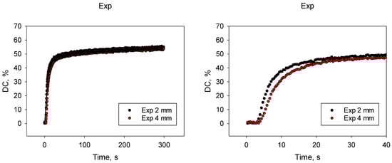 For each material, the increase in DC with time was described by an exponential sum function as outlined in Equation (2) and previously described in detail in []
