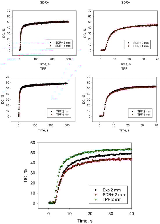 The difference in DC kinetic between the 2 mm and 4 mm depths is very small, with a significantly lower parameter “b” and a significantly higher parameter “c” being observed for Exp at the bottom of the 4 mm samples. All kinetic parameters for the C=C double bond conversion were identical for the 2 and 4 mm depths for SDR+, while for TPF, parameter “a” was significantly lower at the 4 mm depth. In all materials, the DC at the end of the 300 s of real-time observation was statistically the same regardless of depth. The significance of the comparison was assessed taking into account the standard error to calculate the 95% confidence interval, which was the parameter value from which 1.96 × standard error was added and subtracted. Significant differences occur when the calculated confidence intervals do not overlap.