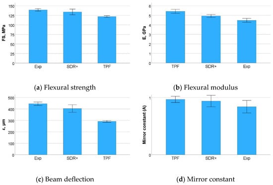 Outcome of the three-point bending test: (a) flexural strength (FS); (b) flexural modulus; (c) beam deflection, and (d) mirror constant. Presented data are mean values with 95% confidence interval.