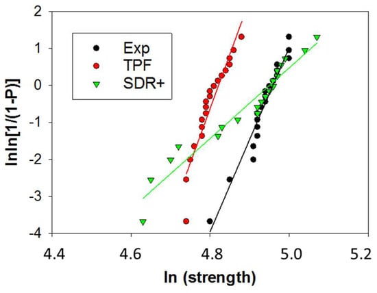 Weibull diagram representing the empirical cumulative distribution function of the strength data in the analyzed composites. Linear regression was used to numerically evaluate the goodness of fit and estimate the parameters of the Weibull distribution. Weibull parameters (m) and coefficient of determination of the regression model (R2) are summarized in Table 5.