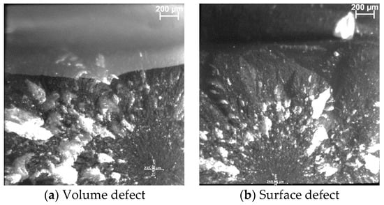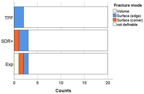 Four fracture patterns were identified, with the absolute highest percentage of failures for all materials being due to volume defects: from 85% for SDR+ and Exp to 90% for TPF. The small remainder of the fractures were identified as surface defects located either at the edge or corner of the fractured sample. One fracture out of sixty was classified as indefinable because the fracture pattern did not allow for identification of the fracture origin (Figure 11).