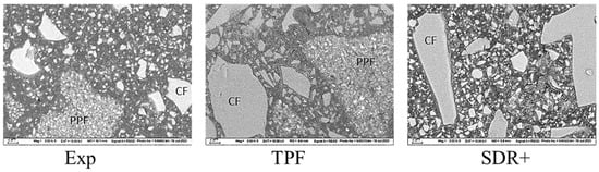 The scanning electron microscopy (SEM) evaluation is presented in Figure 13. To enable distinction between the structural appearance of the individual components of the filler systems, scanning electron microscopy was performed in electron backscatter diffraction mode. Fillers that contained higher-atomic-order elements in their composition therefore appeared lighter. In addition to compact fillers, both Exp and TPF obviously contained pre-polymerized fillers (PPF). The compact fillers were irregular in shape and larger in TPF and SDR+ than in Exp. Their chemical nature also appeared to differ, with higher-atomic-order elements associated with Exp.