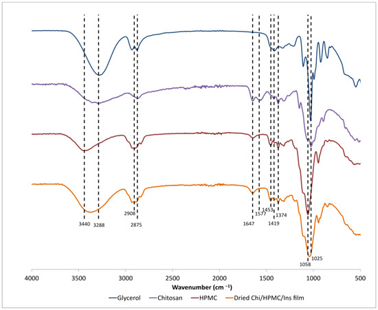 FTIR-ATR spectra of dry chitosan, HPMC, and the dried Chi/HPMC/Ins film.