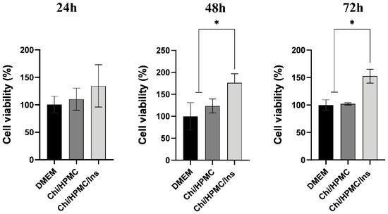 Effect of Chi/HPMC/Ins hydrogel on the cell viability of human keratinocytes (HaCaT). An increase in the cell viability of keratinocytes was produced by the Chi/HPMC/Ins hydrogel after 24 h, 48 h and 72 h of treatment, as evidenced by the MTT assay method. Values are represented as the mean ± SD tested by one-way ANOVA with Tukey’s post hoc test. The experiments were performed in triplicate. * p < 0.05.
