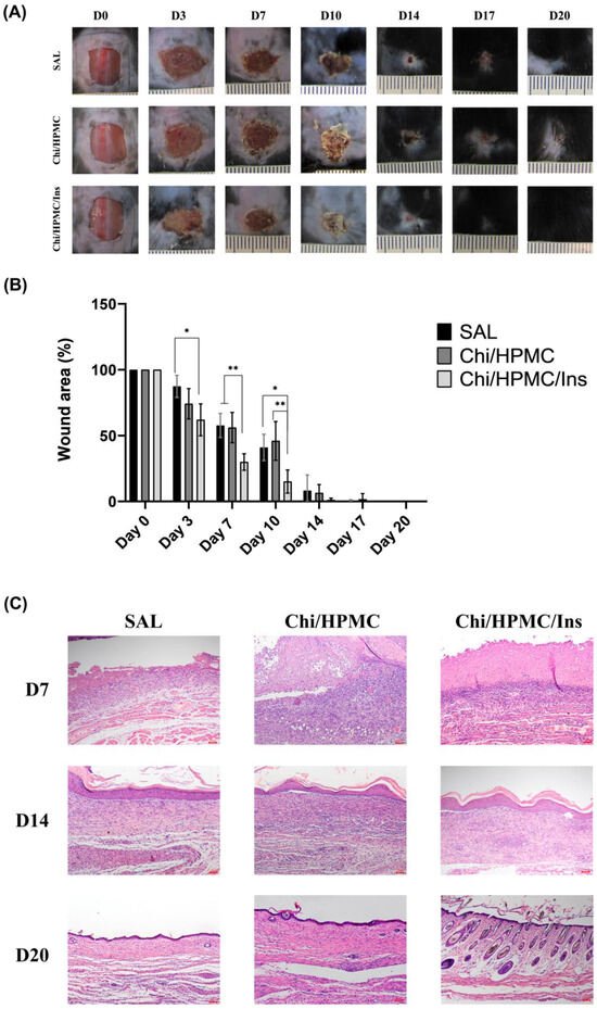 A full-thickness cutaneous wound in diabetic mice was established to evaluate the efficiency of Chi/HPMC/Ins hydrogels in promoting wound healing. Mice were divided into three groups for in vivo testing: the saline group (negative control group), Chi/HPMC hydrogel group, and Chi/HPMC/Ins hydrogel group. The wound healing was monitored for 20 days and photographs were taken at different time points using images captured with a digital camera (Figure 6A). The Chi/HPMC/Ins hydrogel group presented a tendency towards greater retraction in the wound area on days 3 (p < 0.05), 7 (p < 0.01), and 10 (p < 0.05) compared to the saline group and on days 7 and 10 (p < 0.01) and compared to the Chi/HPMC group (Figure 6B).
