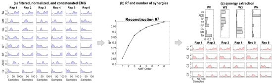 A scheme of the EMG workflow: (a) EMG signals are filtered, rectified and normalized. All the repetitions are concatenated; (b) the reconstruction R2 is computed and the number of synergies achieving at least R2 = 0.90 is selected; (c) synergies are extracted. Rep indicates the number of the strides considered for the analysis.