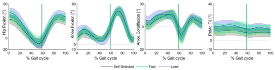 Sagittal plane angular kinematics during overground walking. Ensemble means (thick lines) and standard deviation (shaded regions) across participants of hip and knee flexion, ankle dorsiflexion and pelvic tilt across the three experimental conditions: self-selected (black curve), fast (blue curve) and load (green curve) conditions.