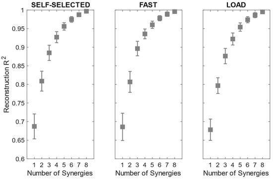 The reconstruction R2 curves for all the participants in each condition are portrayed in Figure 3. The number of extracted synergies was chosen as the minimum number needed to explain at least 90% of the data variation [40].