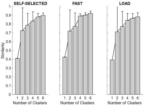After synergy extraction, for each of the experimental conditions, we quantified the mean synergies via K-means clustering. In Figure 4, we showed the intra-cluster similarity achieved in the self-selected, fast and load conditions when increasing the number of clusters from one to six. The chosen number of clusters for the self-selected condition was five, since the increase in intra-cluster similarity was 0.047 between four and five clusters and 0.016 between five and six clusters, and therefore below the defined similarity threshold (adding more clusters led to no substantial improvement in synergy grouping). Four clusters were identified for the fast condition, as the increase in intra-cluster similarity between four and five clusters was 0.010. For the load condition, the right number of clusters was not clearly identified because the increase in intra-cluster similarity between four and five clusters was 0.024, just slightly below the predefined threshold. Therefore, we reported the results for both the four and five clusters.