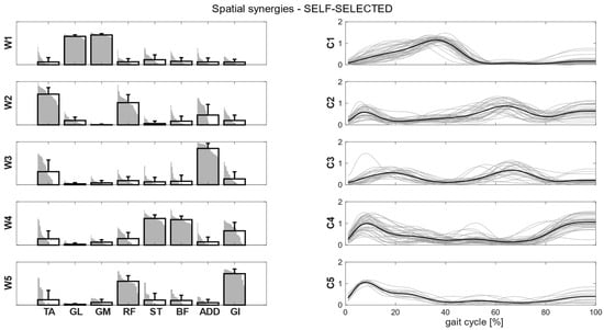 Composition (synergy structure, left column) and temporal coefficients (right column) for matched synergies for the identified clusters, in the self-selected condition. Synergies represent the activation level of each muscle, while the temporal coefficients indicate the timings of each synergy during the gait cycle. Bold black bars are the mean synergy of the cluster, while the gray bars represent all the synergies belonging to the cluster. Bold black lines represent the mean temporal coefficient of the cluster, while the gray lines represent all the temporal coefficients belonging to the cluster.