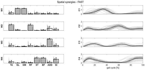 Composition (synergy structure, left column) and temporal coefficients (right column) for matched synergies for the identified clusters in the fast condition. Synergies represent the activation level of each muscle, while the temporal coefficients indicate the timings of each synergy during the gait cycle. Bold black bars represent the mean synergy of the cluster, while the gray bars represent all the synergies belonging to the cluster. Bold black lines are the mean temporal coefficient of the cluster, while the gray lines represent all the temporal coefficients belonging to the cluster.