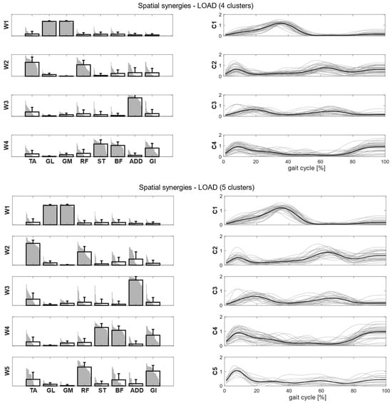 Composition (synergy structure, left column) and temporal coefficients (right column) for matched synergies for the identified clusters in the load condition in two cases: four clusters (upper panel) and five clusters (lower panel). Synergies represent the activation level of each muscle, while the temporal coefficients indicate the timings of each synergy during the gait cycle. Bold black bars represent the mean synergy of the cluster, while the gray bars represent all the synergies belonging to the cluster. Bold black lines are the mean temporal coefficient of the cluster, while the gray lines represent all the temporal coefficients belonging to the cluster.