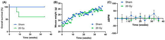 Survival and pulmonary function outcomes. (A) Overall survival in irradiated animals showing a 40% decrease in the irradiated animals compared to sham controls. (B) Daily body weights (g) in sham controls and irradiated mice showing no changes over time. (C) Changes in breathing rates (BPM) for controls and irradiated animals over time; no changes were detected between the two groups. Data are represented as means, with error bars representing the standard error of the mean (SEM).